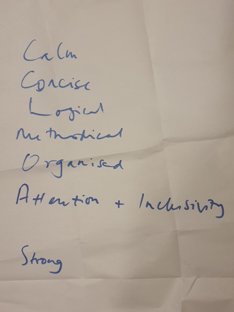 I was described as calm, considered, logical, methodical, organised, inclusive and paid attention to everyone, and strong when I needed to pull people back on topic and keep them to time. One person even said that they aspired to be like me.
