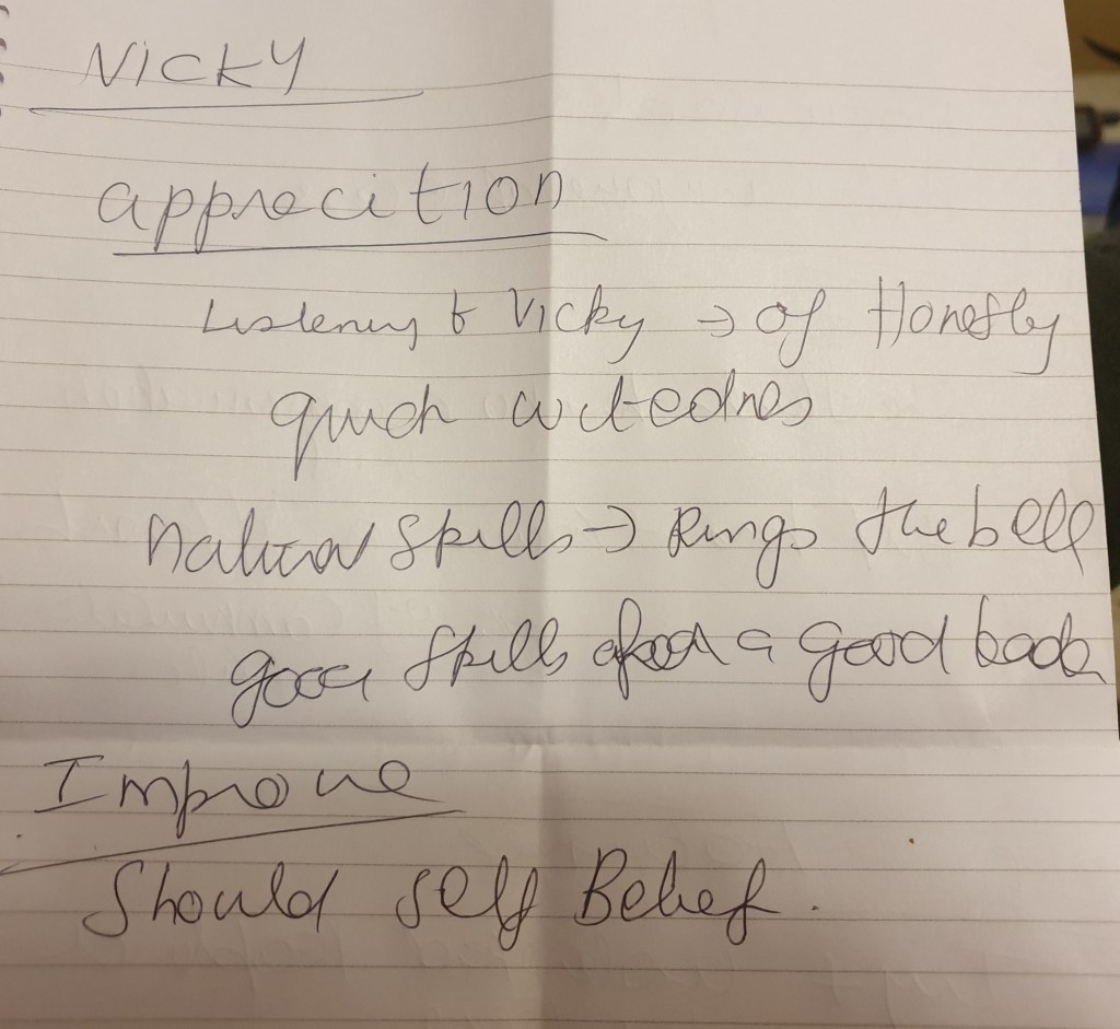The suggestions about what I need to improve on were having a greater sense of self belief, understanding others a bit more and being aware of my own ability. One of the comments I had made about myself earlier in the day was that I don’t consider myself a people person, but everyone disagreed and felt that I had been open, friendly, curious, caring and inclusive and that I should try to stop seeing myself that way.